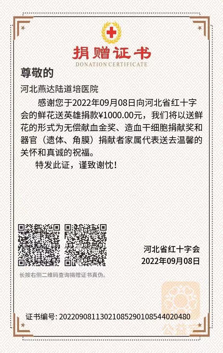2022年河北燕達(dá)陸道培醫(yī)院向河北省紅十字會(huì)捐款。