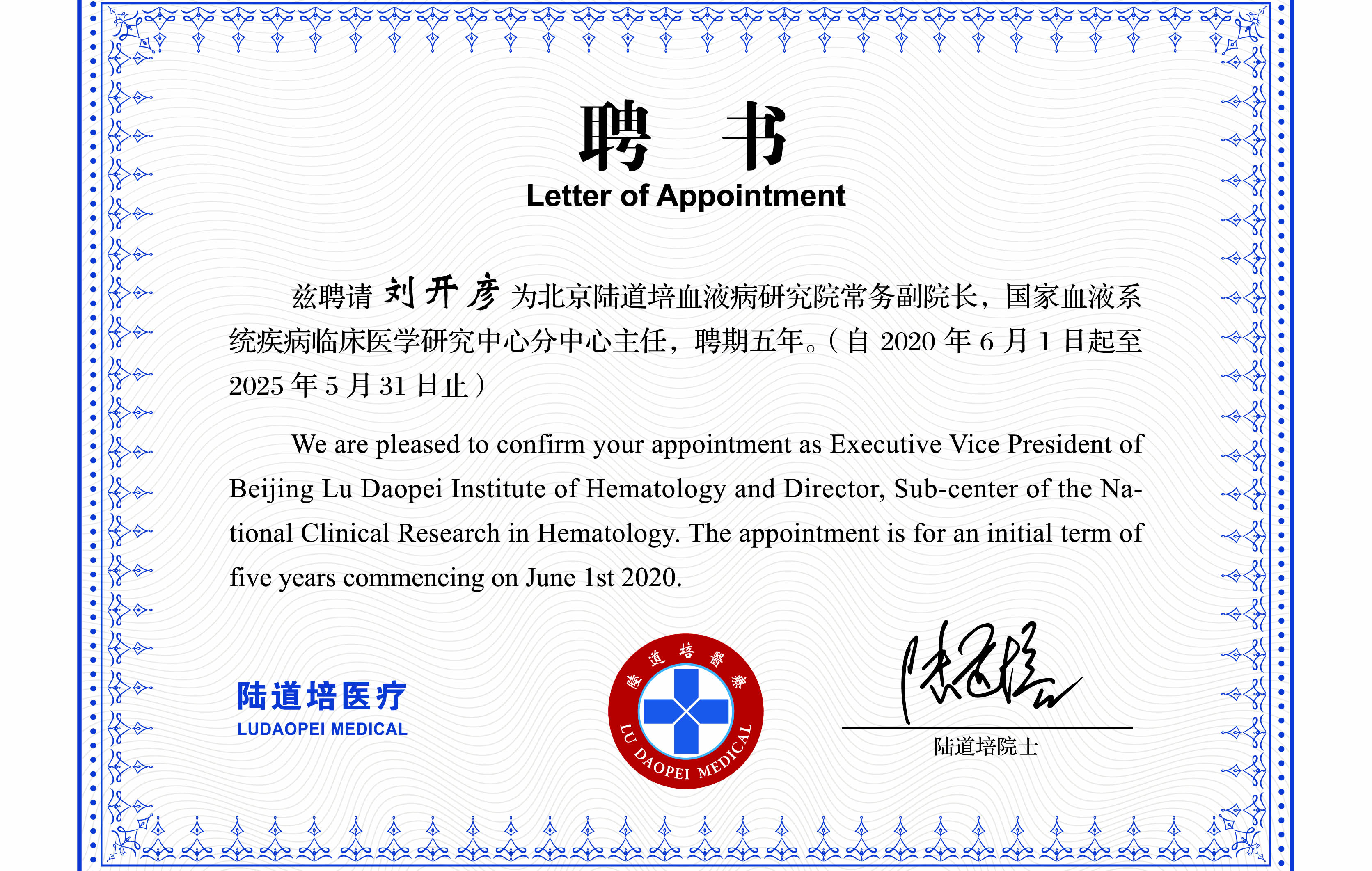 根據(jù)陸道培醫(yī)療集團(tuán)戰(zhàn)略發(fā)展需要,經(jīng)集團(tuán)管理層研究決定:任命劉開彥教授為北京陸道培血液病研究院常務(wù)副院長、國家血液系統(tǒng)疾病臨床醫(yī)學(xué)研究中心(分... 【詳情】