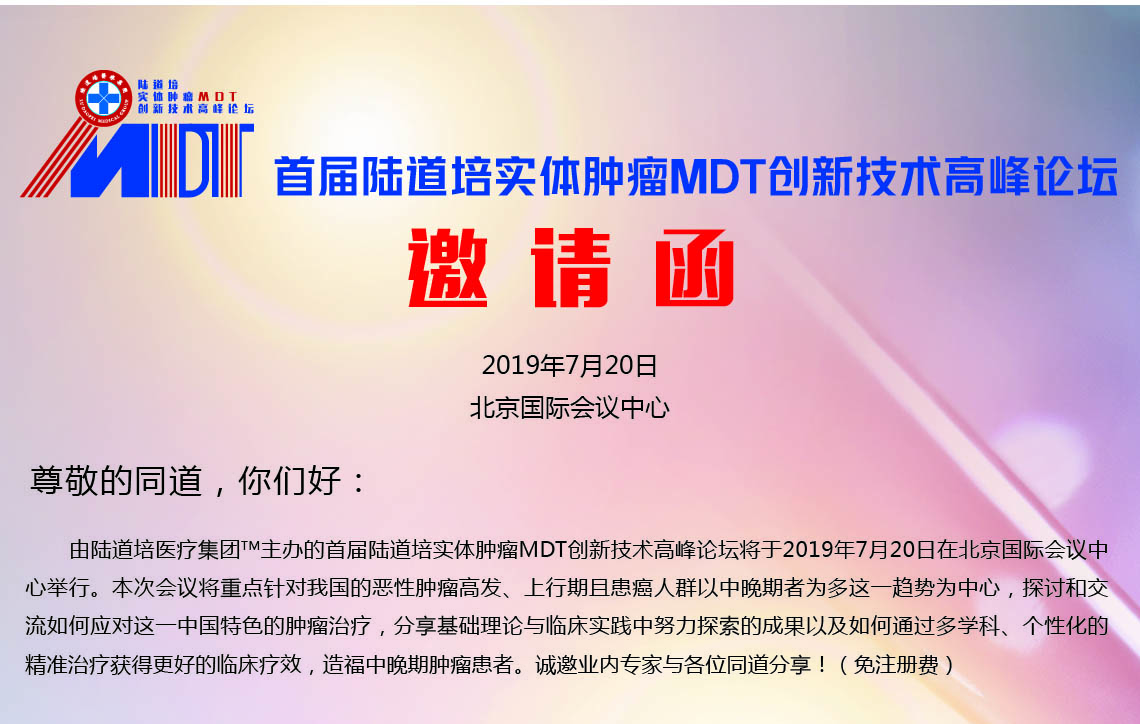 由陸道培醫(yī)療集團(tuán)主辦的“首屆陸道培實(shí)體腫瘤MDT創(chuàng)新技術(shù)高峰論壇”將于2019年7月20日在北京國(guó)際會(huì)議中心舉行。 【詳情】