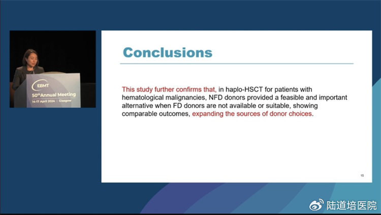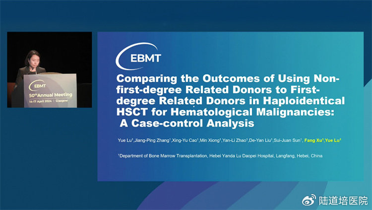 當(dāng)?shù)貢r間,4月16日下午15:15,由陸道培醫(yī)院骨髓移植科胥方醫(yī)生代表盧岳主任團(tuán)隊在“Optimising donor Choice”環(huán)節(jié)中,口頭匯報了“Comparing the Outcomes of Using Non-First-Degree Related Donors to First-Degree Related Donors in Haploidentical HSCT for Hematological Malignancies: A Case-Control Analysis”的臨床研究成果,研究證實了在單倍體造血干細(xì)胞移植中,采用非直系供體在療效及安全性方面均可以與直系供體相媲美,這也為臨床上擴(kuò)展單倍體移植供者的可選擇范圍提供了進(jìn)一步的證據(jù)支持。盧岳主任團(tuán)隊這一項研究受到了頗多關(guān)注。