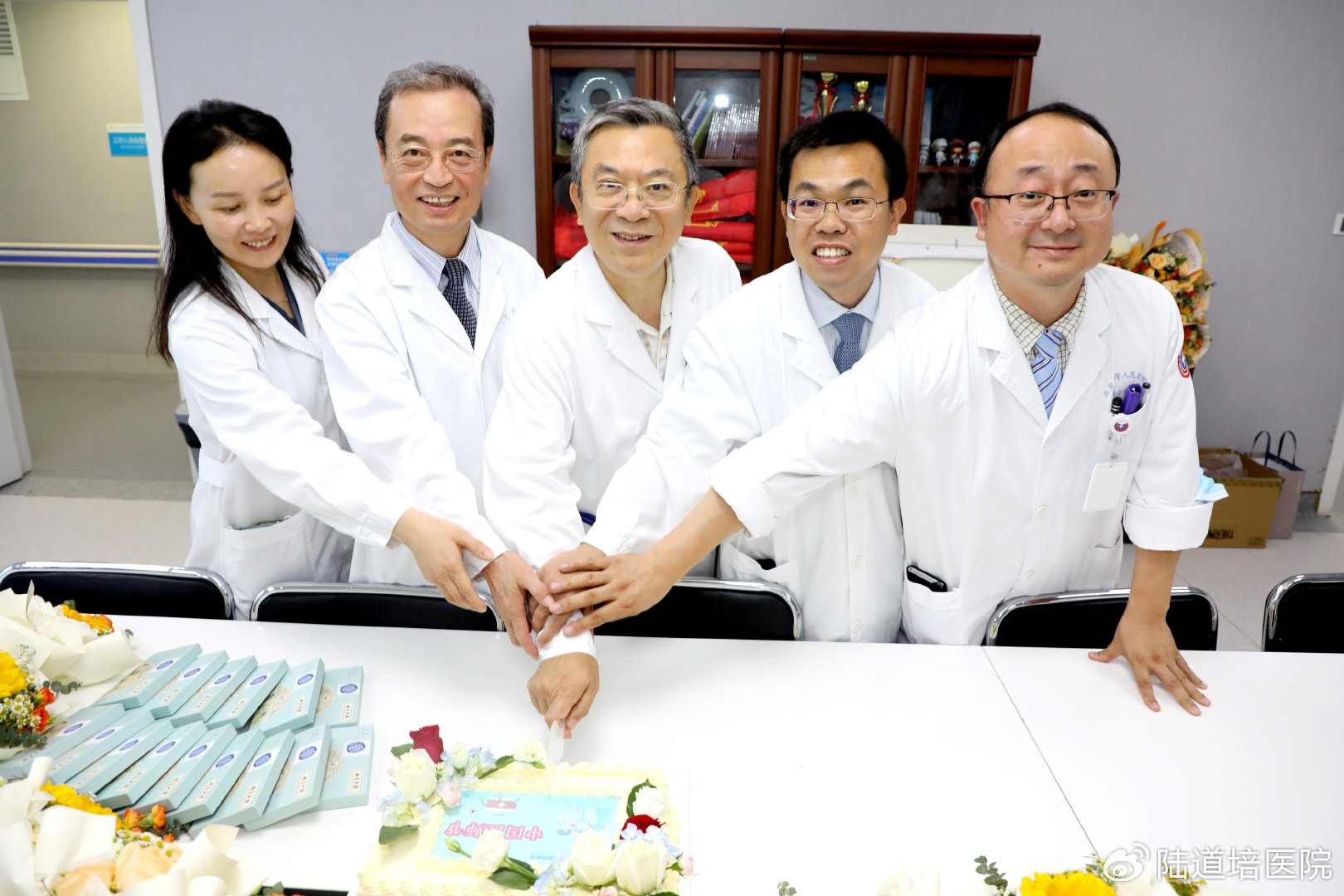 8月16日,中國工程院院士、北京大學(xué)血液病研究所所長黃曉軍院士、北京陸道培血液病醫(yī)院醫(yī)療常務(wù)副院長王景文教授、聯(lián)合病房孫于謙主任等醫(yī)師團(tuán)隊(duì),在病例談?wù)?、大查房結(jié)束之后,在血液二病區(qū)會(huì)議室進(jìn)行了簡單的慶祝,并以切蛋糕的方式共度節(jié)日。